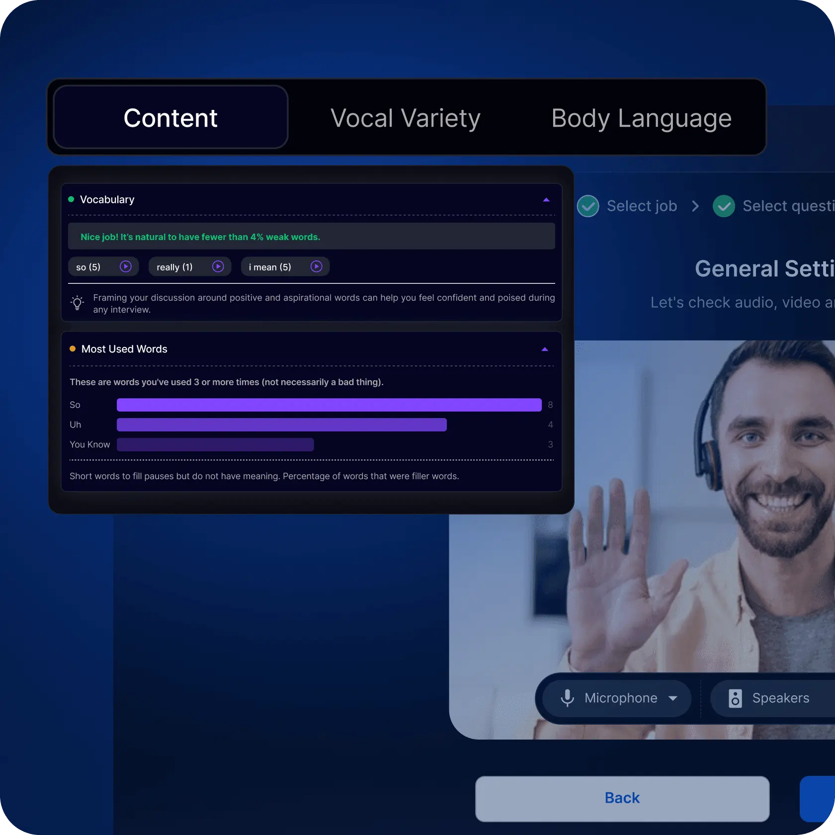 Improve speech by analysing filler words and voice patterns with in-depth AI feedback on body language and non verbal behavior